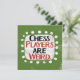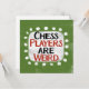 "Chess Players Are Weird" is a cute text design in green with black and red text, along with a white accent shape and white textured whimsical dots surrounding it.