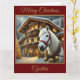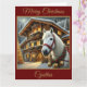 Un beau cheval blanc se dresse devant une maison alpine festive dans cette carte de Noël enchanteresse. Ajoutez votre propre texte personnalisé.