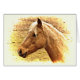 Cette carte blanche présente un beau cheval doré et marron éclairé par le soleil jaune.