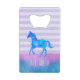 Un ouvre-bouteille personnalisé avec un joli cheval aquarelle aux couleurs bleu et violet. Courir sauvage et libre. Placez-vous sur un arrière - plan à rayures violettes horizontales avec un flair vintage. Une bordure d'aquarelle bleue et rose est superposée sur le fond.
