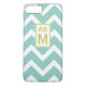 Coque iphone personnalisable avec motif de chevron bleu et blanc, étiquette chartreuse et monogramme. Il est disponible en variété de couleurs et variété de coques et de manches.