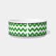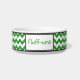 Stylish ceramic cat bowl designed with a green & white chevron zigzag pattern and personalized with your pet's name.