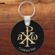 Chi-ro christogram icon with alpha and omega letters. Monogram forming abbreviation for the name of Jesus Christ. Custom background colour. Custom text on both sides.
