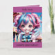 Carte d'anniversaire modifiable avec une fille Chibi aux cheveux rose et bleu et un arrière - plan de foire. Carte amusante pour toute occasion, il suffit de changer le texte.