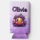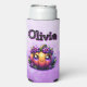 An adorable personalized Halloween can cooler that features a cute black cat in a witch's hat with a pumpkin. bat and cute purple and orange elements. Lots of black, purple and orange elements. Just add a name in the personalize area!