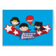 Check out Chibi Wonder Woman, Chibi Superman, Chibi Flash, and Chibi Batman gathered around the Justice League of America logo with red and white stars.