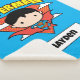 Check out Chibi Superman flying in the clouds with his super hero name overhead and red polka dot shield shape behind him.