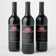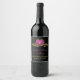Elegant black 50th wedding anniversary full size wine labels, with graphics of golden flourishes and a gold outlined pink heart, with gold graphic text reading 50. Personalize the pink and golden yellow custom text to read what you want.