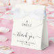 Chic light cream wedding favour box featuring "a sweet thank you" in a mix of simple typography and an elegant script with swashes, your first names joined together by a heart and your wedding date.