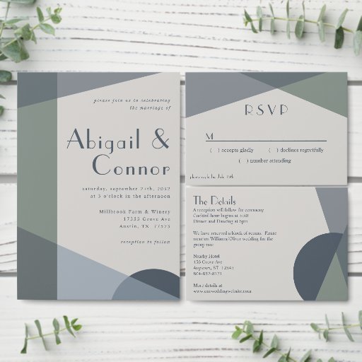 Elements: abstract geometric shapes, colour blocks, chic sans serif font for names, understated serif fonts for details. Colours: sage, mint, pistachio, evergreen, dusty blue, botanical, navy, evening, midnight,cetacean, parchment, light grey, platinum. Themes: modern, minimalist, abstract, clean, cheerful, cool tones, understated, boho, scandi, contemporary, industrial. Collection: Chic Abstract Geometric Sage Navy Dusty Blue Wedding Collection Product Type: RSVP