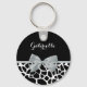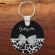 A chic black and white giraffe print keychain with an elegant silver grey ribbon tied into a feminine bow. Personalize this girly animal print design by adding your name. Flat printed image, not actual bow.