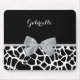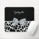 A chic black and white giraffe print mousepad with an elegant silver grey ribbon tied into a feminine bow. Personalize this girly animal print design by adding your name. Flat printed image, not actual bow.