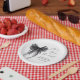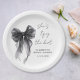 Chic paper plates for your bridal shower featuring an elegant watercolor of a black coquette bow, "She's tying the knot" in a calligraphy script, and the bride's name and the shower date in simple modern lettering.