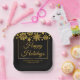 Chic corporate Christmas party plate with Happy Holidays written in elegant gold cursive script under a beautiful border of snowflakes falling on modern black holiday decor. Customize these professional holiday plates with your company or business name.