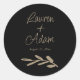 Add a touch of modern elegance to your wedding favors with this chic round wedding sticker featuring a deep black background and faux gold script typography. Personalized with your names and wedding date, this stylish sticker is perfect for sealing envelopes, decorating favor bags, gift boxes, thank you cards, or welcome bags. The minimalist design and romantic handwritten font create a timeless, sophisticated look for contemporary, classic, or evening weddings.
