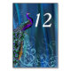 Elégante carte de numéro de table de réception de mariage, avec des graphiques d'un riche arrière - plan satiné bleu turquoise, avec un bleu fleuri avec un paon coloré. Personnalisez le numéro blanc pour chaque table à la réception. Produits correspondants disponibles.