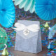 Fancy wedding favour gift box done in a light blue Fleur damask pattern. Graphics of a white shiny looking button, on the flap, has grey script text ready to personalize. Lovely little gift box for candies and anything else you want to give your guests.