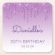 These chic 30th birthday party paper coasters feature a sparkly purple faux glitter drip border and purple ombre background. Personalize them with the guest of honour's name in purple handwriting script, with her birthday and date below in sans serif font.