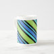 A very stylish Bone China Coffee Mug, with a 'Blue Moons' diagonally striped pattern in bright blue, turquoise and neon green on a black background. Part of the Posh & Painterly 'Blue Moons' collection; from a handpainted paper collage design by Judy Adamson.