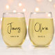 Elevate your toast as husband and wife with our unique set of 2 personalized stemless wine glasses, designed to celebrate each moment of your wedding journey. From the engagement party, rehearsal dinner to the wedding reception and life as newlyweds, these chic glasses will add a touch of elegance to each celebration. Personalized with your names in a stylish calligraphy script and "Bride"and "Groom" in elegant serif typography.