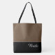 This lovely fashion forward tote bag shows the word "Bride" in white text colour over black with the upper tote bag in custom Latte Brown. Has plenty of room for personalized text. Graphics and text are on both sides of this tote bag. Black handle. Customize further or buy as shown.