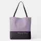 This lovely fashion forward tote bag shows the word "Maid of Honour" in white text colour over the deepest dark smoky purple-amethyst with the upper tote bag in custom Sugared Plum. Has plenty of room for personalized text. Graphics and text are on both sides of this tote bag. Black handle. Customize further or buy as shown.