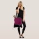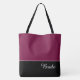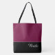 This lovely fashion forward tote bag shows the word "Bride" in white text colour over black with the upper tote bag in custom Cassis. Has plenty of room for personalized text. Graphics and text are on both sides of this tote bag. Black handle. Customize further or buy as shown.