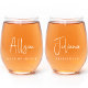 Elevate your bridal party's toasts with our unique set of 2 personalized stemless wine glass keepsake gifts for your bridesmaids and maid of honour to enjoy at your engagement party, bridal shower, bachelorette party, rehearsal dinner and wedding reception. These chic wine glasses will add a touch of elegance to each event and can be personalized with the name of your maid of honour, bridesmaids, mother, sisters, and more, in a stylish white calligraphy script and their role in elegant white serif typography.