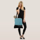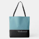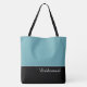 This lovely fashion forward tote bag shows the word "Bridesmaid" in white text colour over black with the upper tote bag in Tropical Pool Blue. Has plenty of room for personalized text. Graphics and text are on both sides of this tote bag. Black handle. Customize further or buy as shown.
