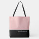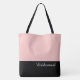 This lovely fashion forward tote bag shows the word "Bridesmaid" in white text colour over black with the upper tote bag in custom Dusty Rose Pink. Has plenty of room for personalized text. Graphics and text are on both sides of this tote bag. Black handle. Customize further or buy as shown.