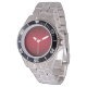 Has heft and feel of expensive stainless steel quartz watches. Good band with safety catch. I removed links, which is easy because engraved arrows show direction to push the linking pins. As always by this seller, the image (a railroad logo) is a perfect reproduction of my emailed image, and is precisely spaced and aligned.