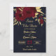 Chic and elegant navy blue save the date card featuring beautiful burgundy flowers and some elegant gold leaves .