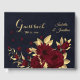 Chic and elegant navy blue wedding guest book featuring beautiful burgundy flowers and some elegant gold leaves .