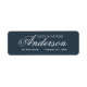 Elegant return address label with a prominent name line in a calligraphic script typeface. First name line in light compressed typeface to offset script. Address details in an understated minimal font, but still clearly readable. Fully personalizable. Contact to assist with customizations to fit your need. NOTE: For proper formatting you may want to manipulate text with spaces and/or line feeds (returns).