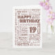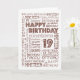 Une carte d'anniversaire chic du 19ème, avec le numéro 19, le mot "dix-neuf" et "joyeux anniversaire", le tout en marron, sur un arrière - plan blanc que vous pouvez changer si vous le souhaitez, à partir d'un design numérique de Judy Adamson. Vous pouvez également modifier le message interne.