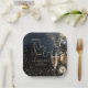 Stylish New Year's Eve party square paper plates feature a champagne glass, clocks, confetti and fireworks on a midnight blue background with your party details in chic lettering. MATCHING items in our collection.
