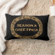 A festive Lumbar Pillow or Cushion with a Christmas wreath of holly, ivy, poinsettias, fir cones and sprigs of fir tree, This hand-drawn Christmas wreath is in gold-effect on a black background, with 'Season's Greetings' in decorative lettering, also in gold-effect.