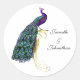 Elegant wedding sticker, with a vintage illustration of a colourful peacock, on a gilded stand. Black script text has the bride and groom's names and is ready to personalize. Lovely finishing touch to your peacock themed wedding invitation envelopes or as gift tags.