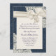 Lovely wedding invitation done in a blue on blue denim floral damask pattern. Graphics of elegant ivory crocheted looking doilies decorate the top right and bottom left corners, with a beautiful ivory satin looking ribbon and bow stretching across the top. Text in dark blue is ready to personalize for your special day. The back of the invitation has the same blue denim damask pattern. Elegant invitation you will cherish for years to come. Matching wedding products available.
