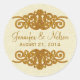 Elegant wedding envelope seal sticker done in a pretty cream and khaki swirl pattern. Graphics of gold tone decorations above and below the golden brown text. Personalize the text, with the bride and groom's names and wedding date. Lovely finishing touch to wedding invitation envelopes and thank you cards.