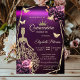 Gold glitter tiara, dress, butterflies, and green roses on a violet background. Invite guests to join you in celebrating this milestone with a design that reflects the magic and joy of your quinceañera.