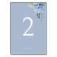 Numéro de table à mariage floral chic et élégant, avec un numéro de table et des noms de couple en option, ainsi qu'un magnifique design hydrangée bleu, à la fois à l'arrière et à l'avant. Le texte est blanc contre un arrière - plan bleu poussiéreux. Personnalisez cette carte pour en faire la vôtre.