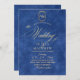 Elegant stylish blue and gold modern wedding invitation with an elegant handwritten font with curls and a monogram of the bride and groom. Classy and elegant, simple and modern invitation.