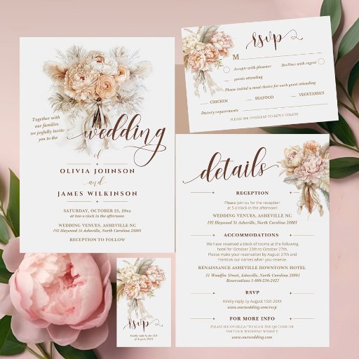 Customize this "Chic Elegant Boho Style Floral Script Wedding Foil Invitation", featuring a Boho Coquette-style watercolor drawing of a bouquet of creamy peonies, feathers, and lace, accented with a graceful bow and elegant handwritten script, with rose gold foil, it exudes timeless elegance and romance. Please get in touch with the store designer for further customization if needed.