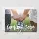 Announce your big news in style with these chic pregnancy announcements featuring your favourite landscape oriented or vertical photo with a white hand lettered text overlay reading "coming soon." Personalize with your name and expected arrival date.