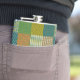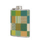 Un Hip Flask chic, avec un Faux Patchwork motif de motifs, bandes et pois tribaux en vert, rouge rouillé, bleu marine et or ancien ; de la collection Posh & Painterly "Jungle Drums".