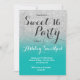 A modern, pretty faux silver glitter shower ombre with turquoise colour block Sweet 16 birthday party invitation with silver ombre pattern fading onto a turquoise background.