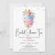 Brightly colored tea party bridal shower featuring four stacked teacups, some floral arrangements, faux gold glitter dots and a modern calligraphy heading.