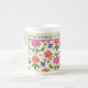A chic Bone China Mug to personalize, with a colourful pattern of Pink and Orange Flowers and Polka Dots on a leaf-textured Ecru Background. Part of the Posh & Painterly 'Rangoli' collection, this pattern can be adjusted to fit any Mug.