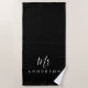 Chic black and white monogrammed beach towel with the text Mr in white elegant script calligraphy. You can customize this luxurious beach towel with your married name. Perfect gift for the newlywed couple with the matching Mrs beach towel or for the bridal shower. Exclusively designed for you by Happy Dolphin Studio. If you need any help or matching products, please contact us at happydolphinstudio@outlook.com. We design beautiful gifts for your perfect wedding!